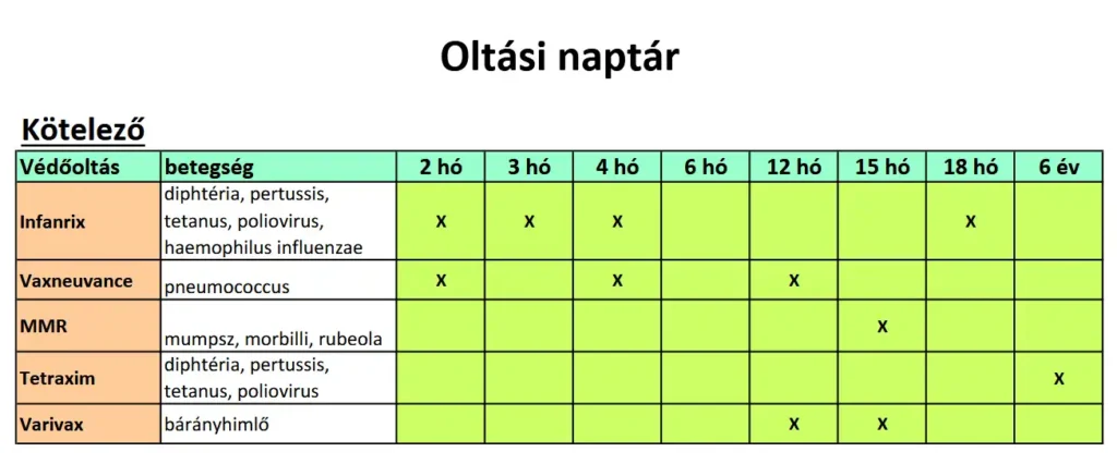 A kötelező oltások az alábbi táblázatban láthatóak:
