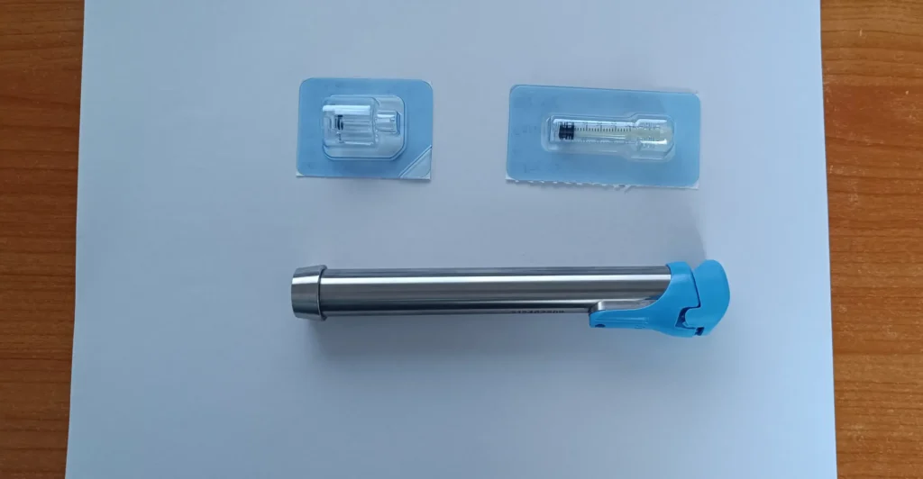 A tűmentes injekciós technológia teljesen eltünteti a tű használatát. Egy speciálisan kialakított felületen keresztül nagy nyomással juttat gyógyszersugarat a testszövetbe. A képen látható fém rúd a rugó, melyet oltás előtt felhúzok, majd hozzáillesztem a képen látható fecskendőt. Közepesen erős nyomással a karra vagy a combra helyezem a fecskendőt, és megnyomom a rugó gombját, ekkor történik a folyadék nagy nyomású kilövése. 3 másodpercig még helyben tartom az eszközt, és elkészültünk.